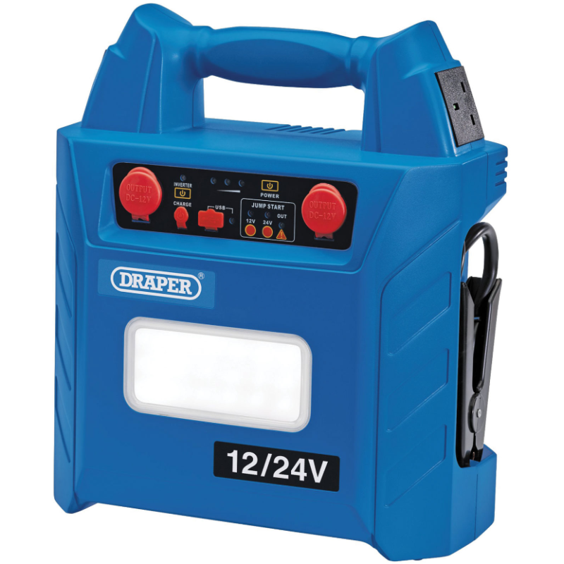 Fitted with LED battery charge indicators, 230V DC to AC inverter, 2x 230V output sockets, 2x 12V output sockets, LED work light, USB output socket and polarity inversion warning.