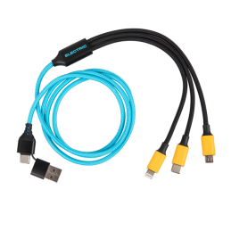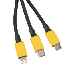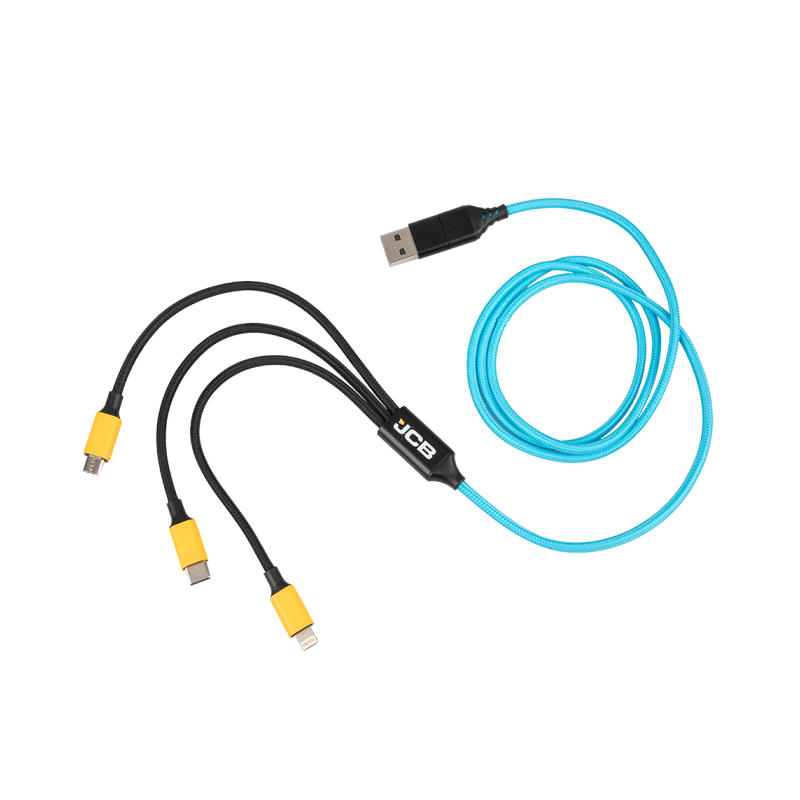 Charge any device wherever you are with this 3-in-1 charging cable. Charging ports include Lightning, Micro-USB and Type-C. Branded with the JCB logo to the port.