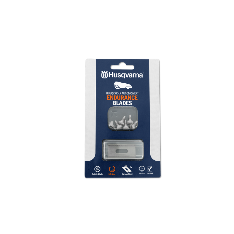 Husqvarna Automower® Endurance blades provide more than twice the lifetime compared to classic blades. The Husqvarna Endurance design allows for improved cutting results by providing cutting edges on all four sides and a harder and sharper edge. Safety blade according to standards. 6 pcs blister.